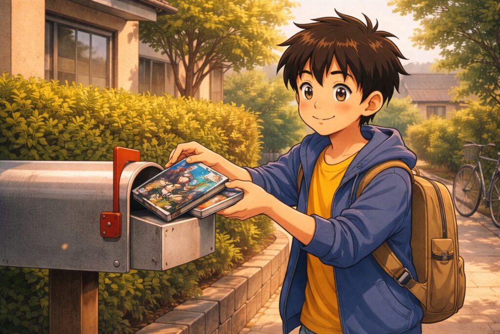 宅配レンタルの仕組みは非常にシンプルです。ネットで予約すると、数日以内にポストに2枚1組のDVDが届きます。見終わったら近くのポストに返却するだけでOK。送料も返送料もかかりません(月額料金に含まれます)。