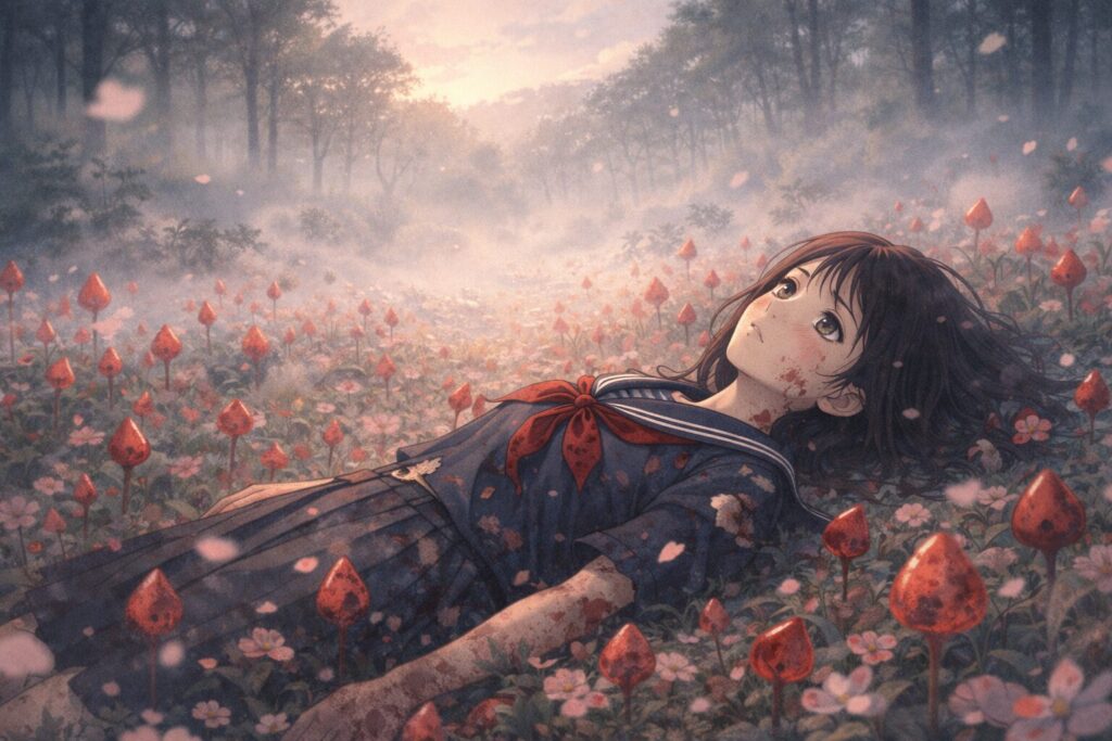 視聴者の感想でよく目にするのが「残酷」「怖い」といった言葉です。しかし、いわゆるグロテスクな描写が延々と続くわけではありません。むしろ、一見すると非常に「美しい」映像が続きます。本作で最も物議を醸し、同時に高い評価を得ているのが、少女たちが傷ついた際に出る血を「色鮮やかな花」として描く演出です。凄惨な戦場で、本来なら目を背けたくなるような負傷シーンが、舞い散る花びらとして表現される。この美しすぎるメタファーこそが、逆に現実の残酷さを際立たせ、見る者に「怖い」と感じさせる狂気を孕んでいるんです。これはサンたちが、あまりにも過酷な現実を受け入れられず、自分の心を守るために世界を繭(コクーン)でコーティングしていることを示唆していると言われています。